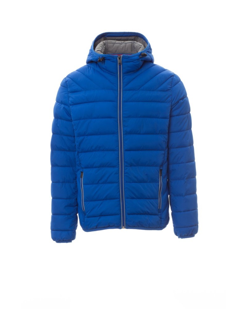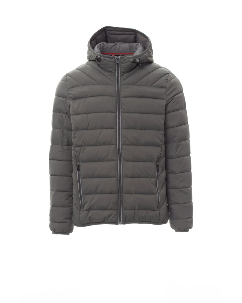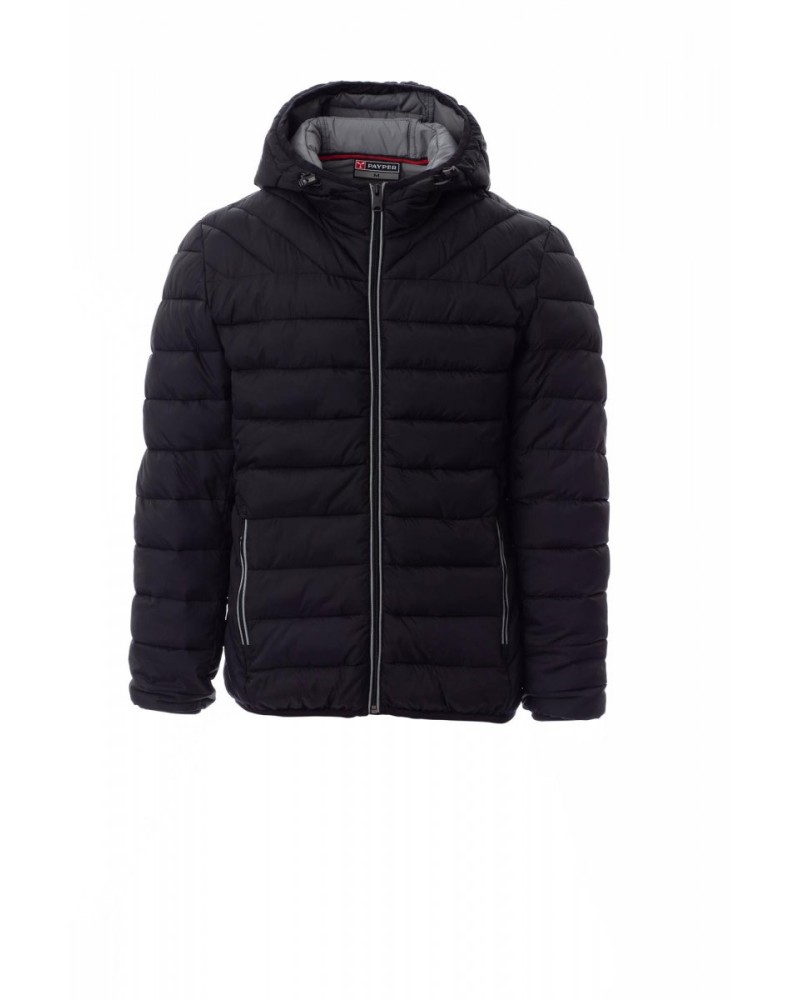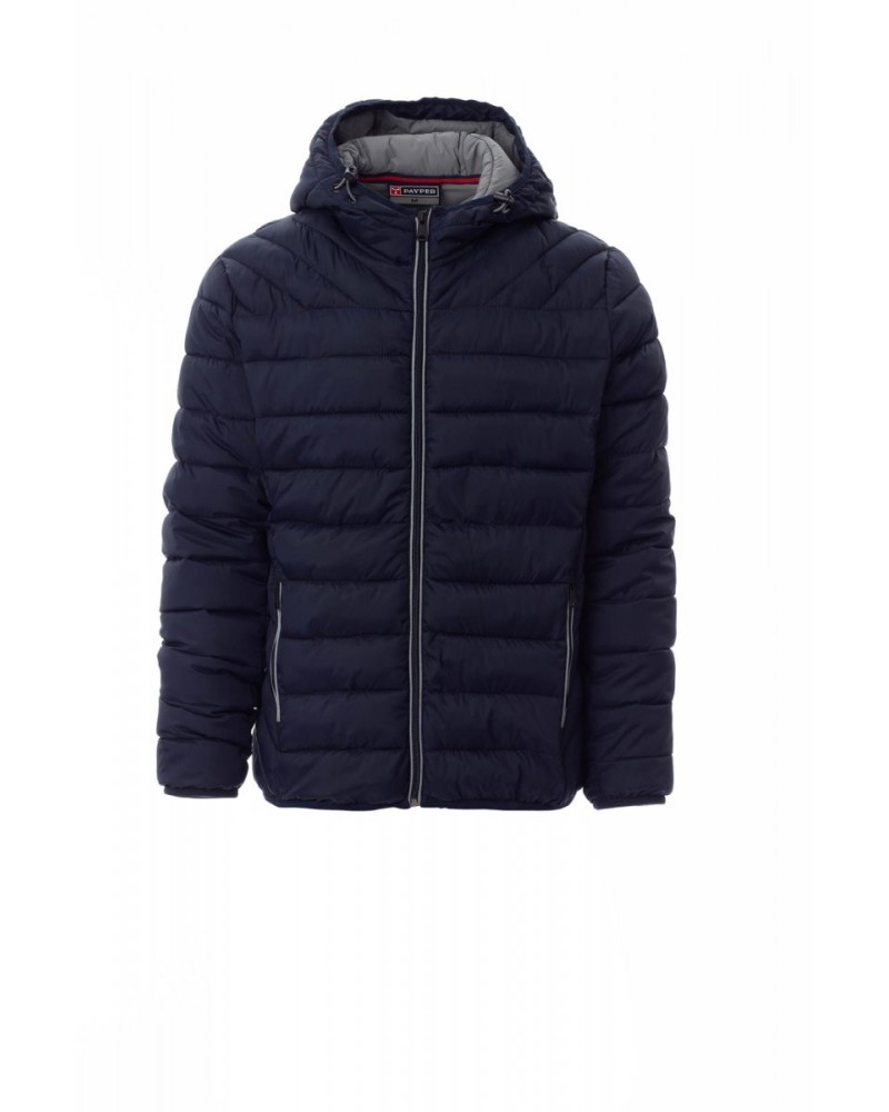 Moška puhovka z oblazinjenjem iz prostih vlaken (160 g/m²), zapenjanje s plastično zadrgo širine 5 mm s kovinskim drsnikom. Nastavljiva kapuca z zateznim zamaškom. Manšete in pas zaključena z ozko obrobo. Dva zunanja žepa z zadrgo. Odsevni rob ob zadrgi. Dva notranja žepa.