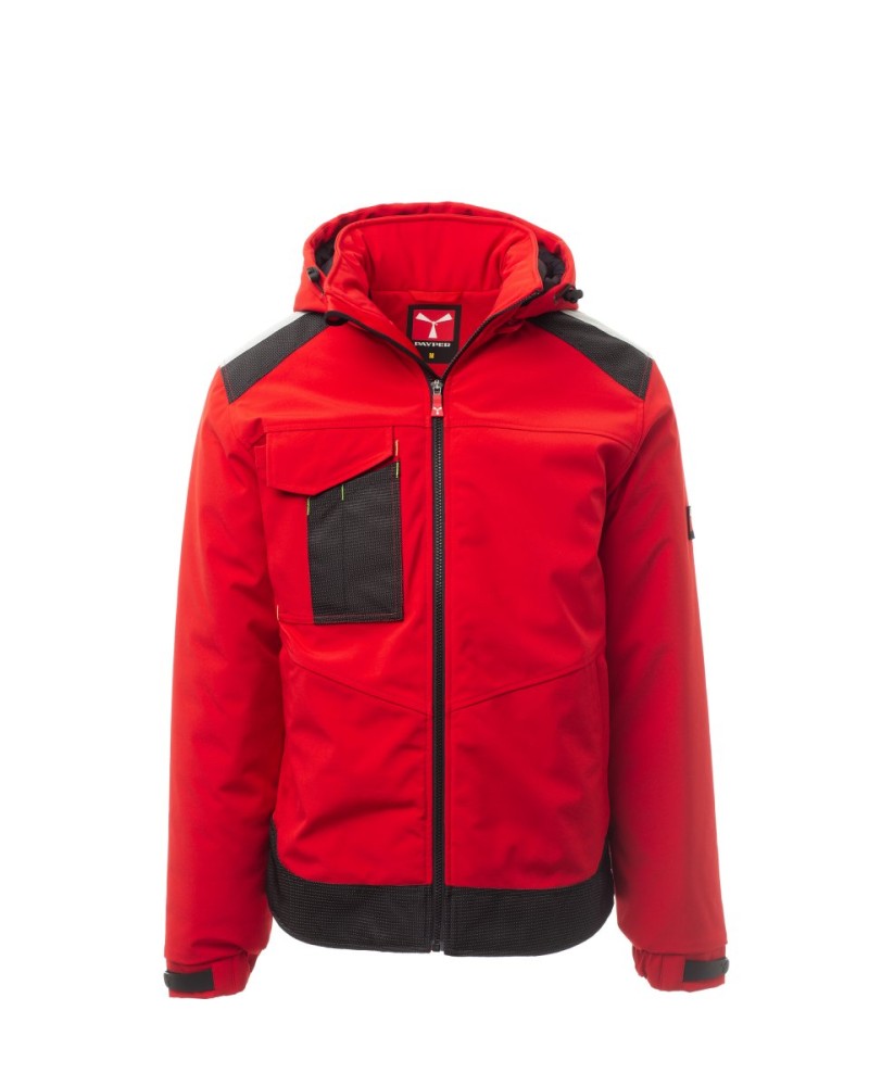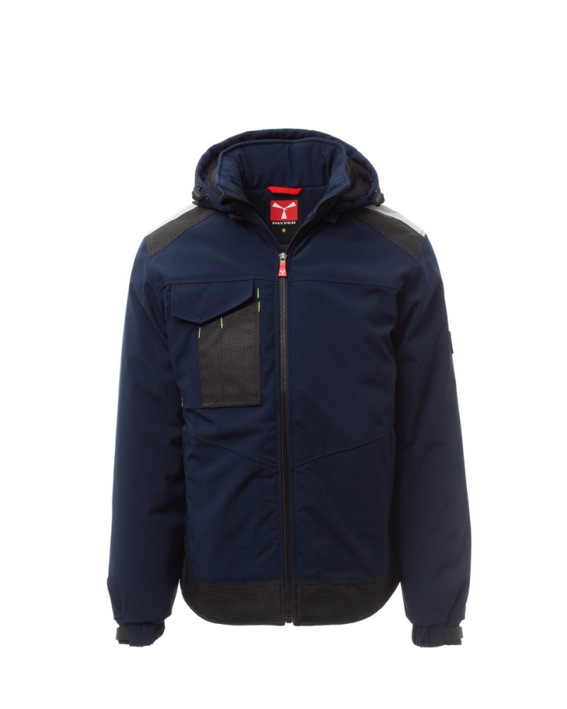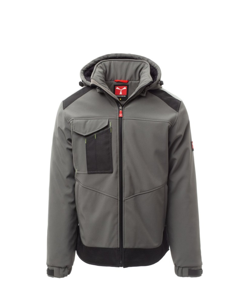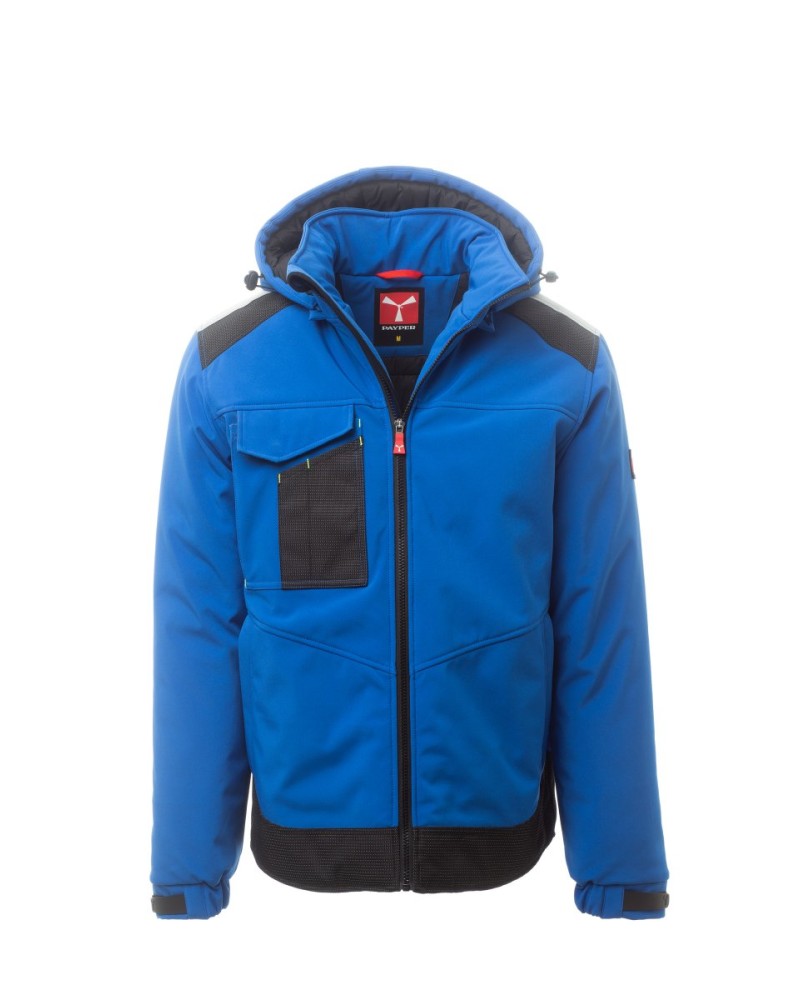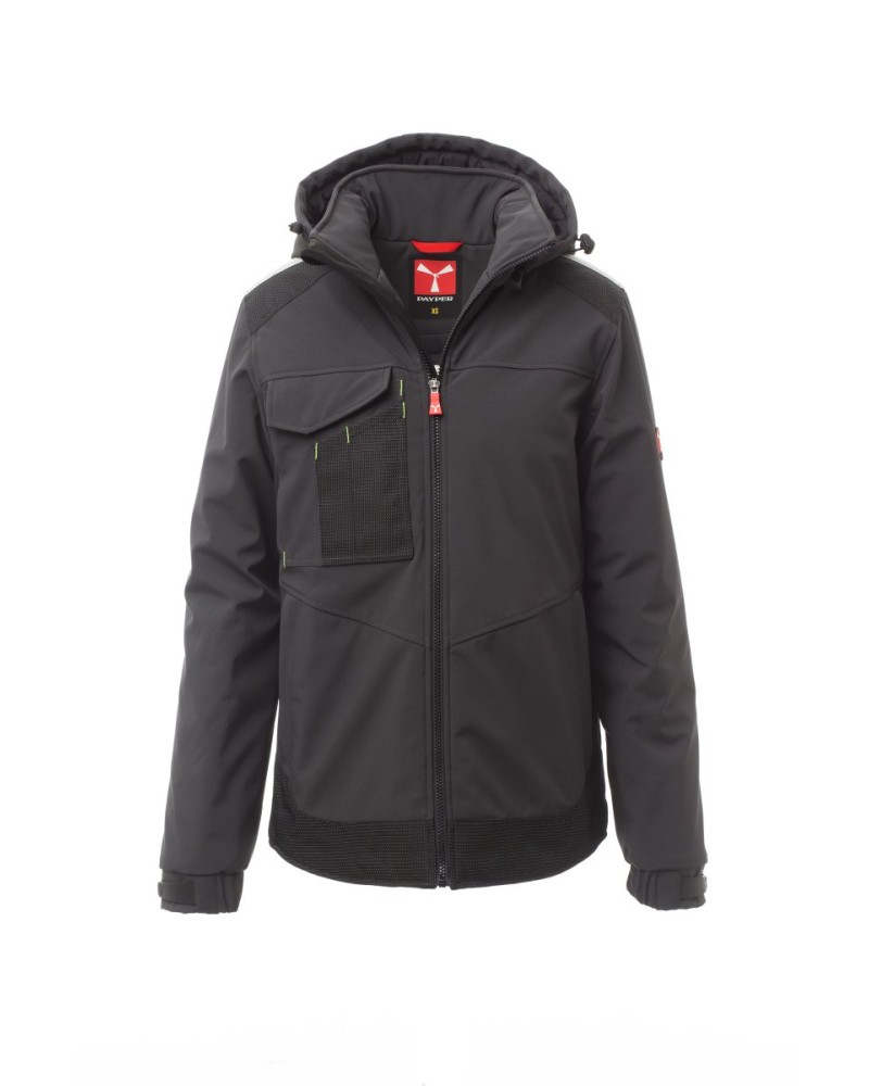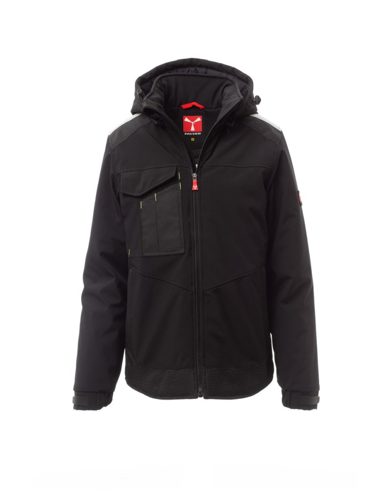 WP 8000 mm H₂O, WVT 5000 g/m² 24h Podložena moška jakna softshell, ovratnik z všitki iz flisa, z zapenjanjem na zadrgo s kovinskim drsnikom za »polavtomatsko zapenjanje« in z jezičkom zadrge po meri. Snemljiva kapuca z vrvico za reguliranje. Odsevni trak na ramenih. Elastični patent na zapestju, nastavljiv z ježkom. Žep na prsnem košu s sistemom Lock System z zavihkom in nosilcem pisala. Dva stranska žepa z zapenjanjem na zadrgo. Dva notranja žepa, prvi nosilec za tablični računalnik z zapenjanjem na ježka in drugi oblikovan z zadrgo na desni strani prsnega koša. Nastavljiv spodnji del s prilagojenimi zateznimi elastikami in odsevnimi cevkami na hrbtni strani.