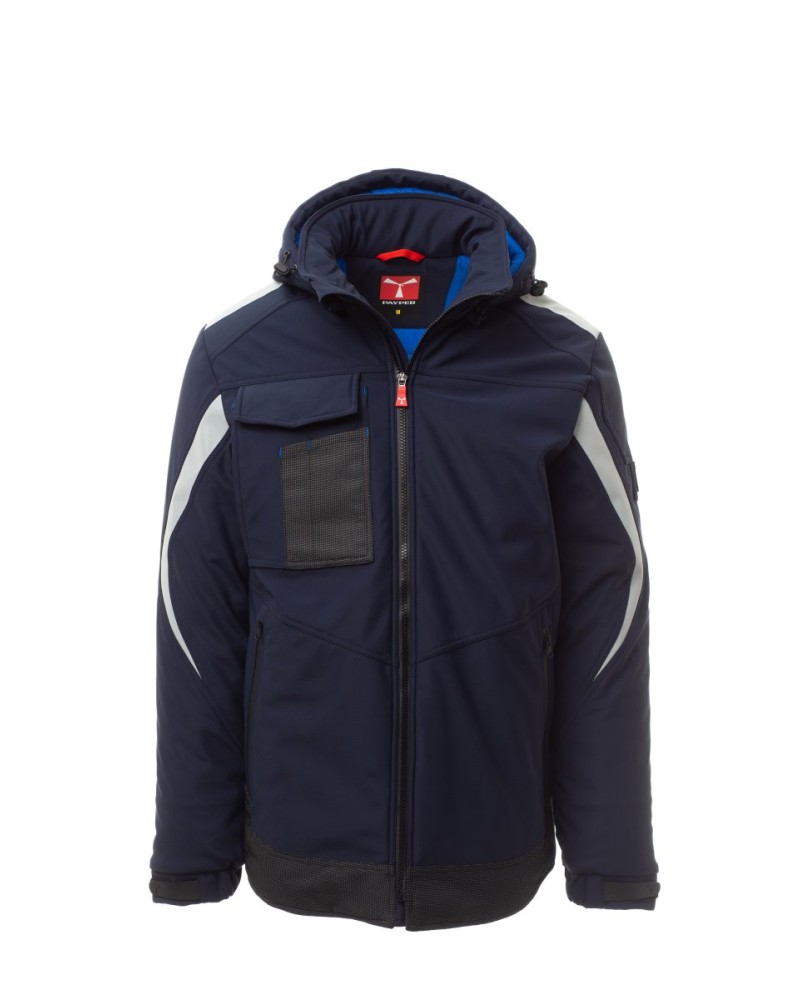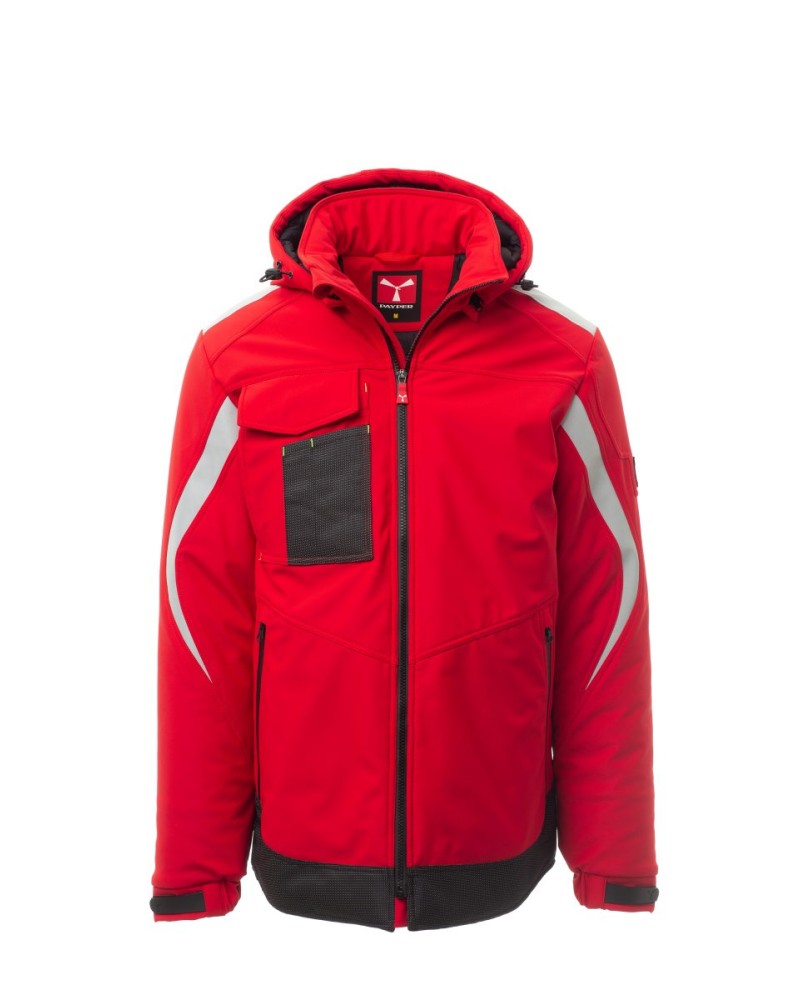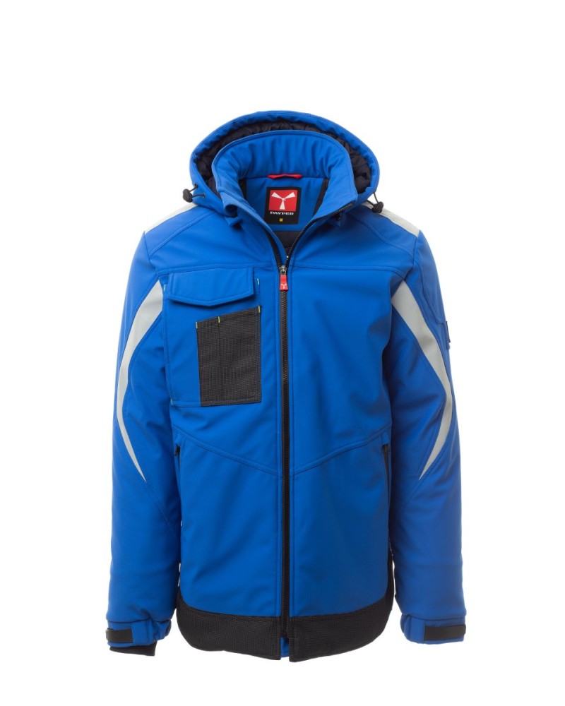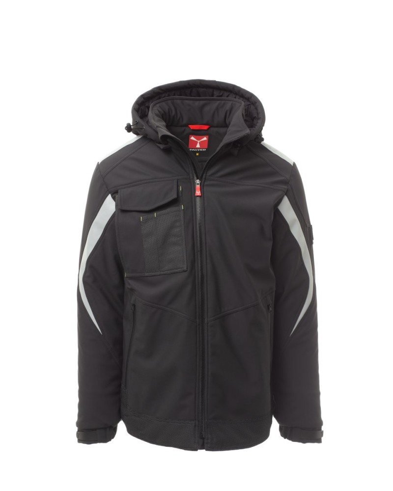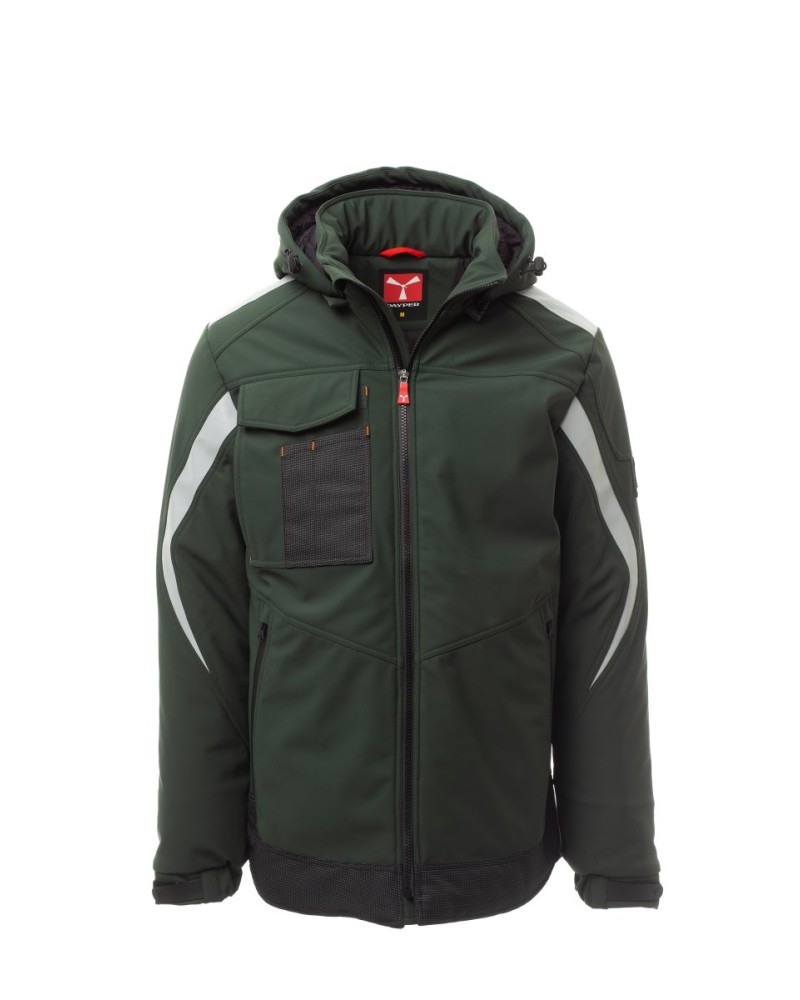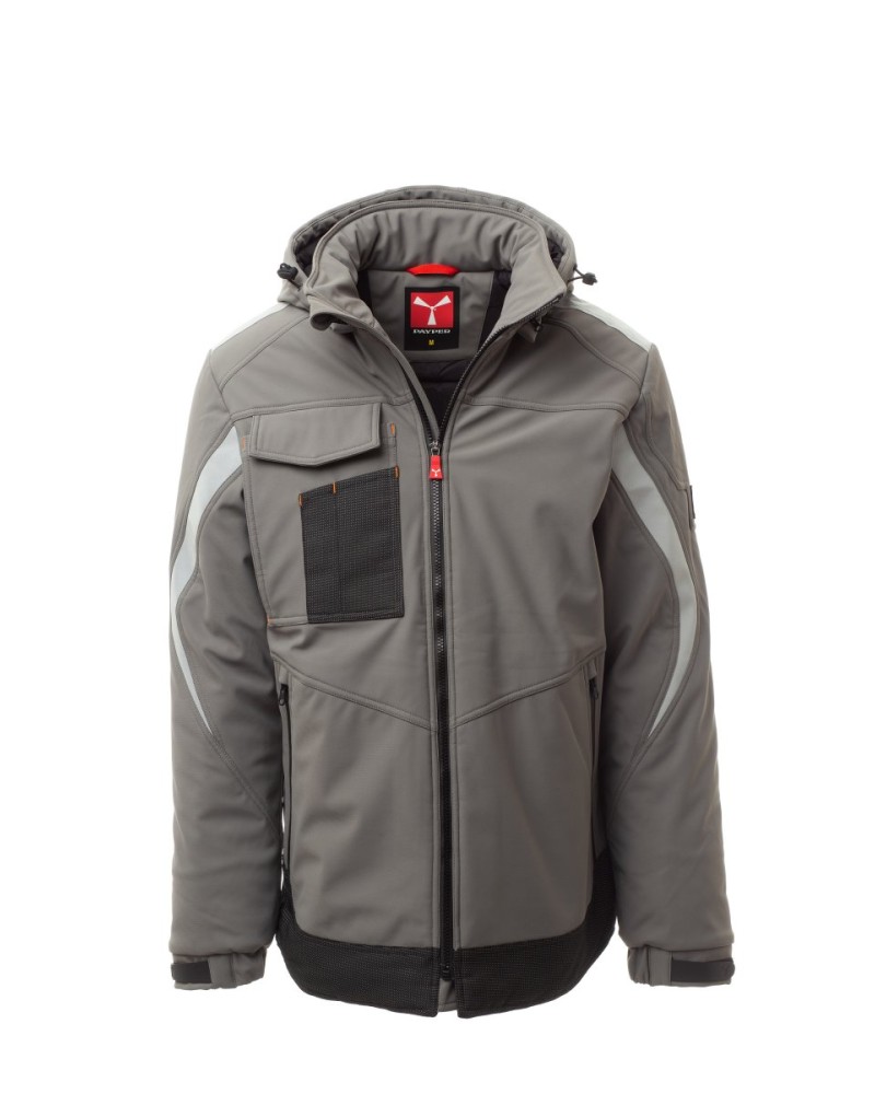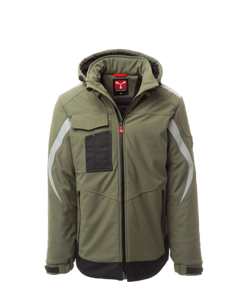 WP 8000 mm H₂O, WVT 5000 g/m² 24h. Podložena jakna softshell za moške z zapenjanjem na zadrgo SBS s kovinskim drsnikom za »polavtomatsko zapenjanje« in z jezičkom zadrge po meri. Snemljiva kapuca z vrvico za reguliranje. Odsevni trak na ramenih in rokah. Elastični patent na zapestju, nastavljiv z ježkom in notranji zapestni patent. Prsni žep s sistemom Lock System z zavihkom nosilcem značkein nosilcem za pisalo. Dva stranska žepa z zapenjanjem na zadrgo in prevlečenim trakom. »Varnostni« element na hrbtni strani z notranjim odsevnim logotipom, zapenjanje s prevlečeno zadrgo. Dva notranja žepa, od katerih je prvi nosilec za tablični računalnik, ki se zapenja na ježka in drugi oblikovan z zadrgo na desni strani prsnega koša. Nastavljiv spodnji del s prilagojenimi zateznimi elastikami. Črtkasta tkanina z odsevnim učinkom.