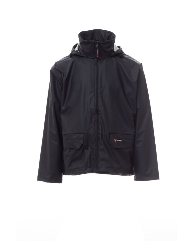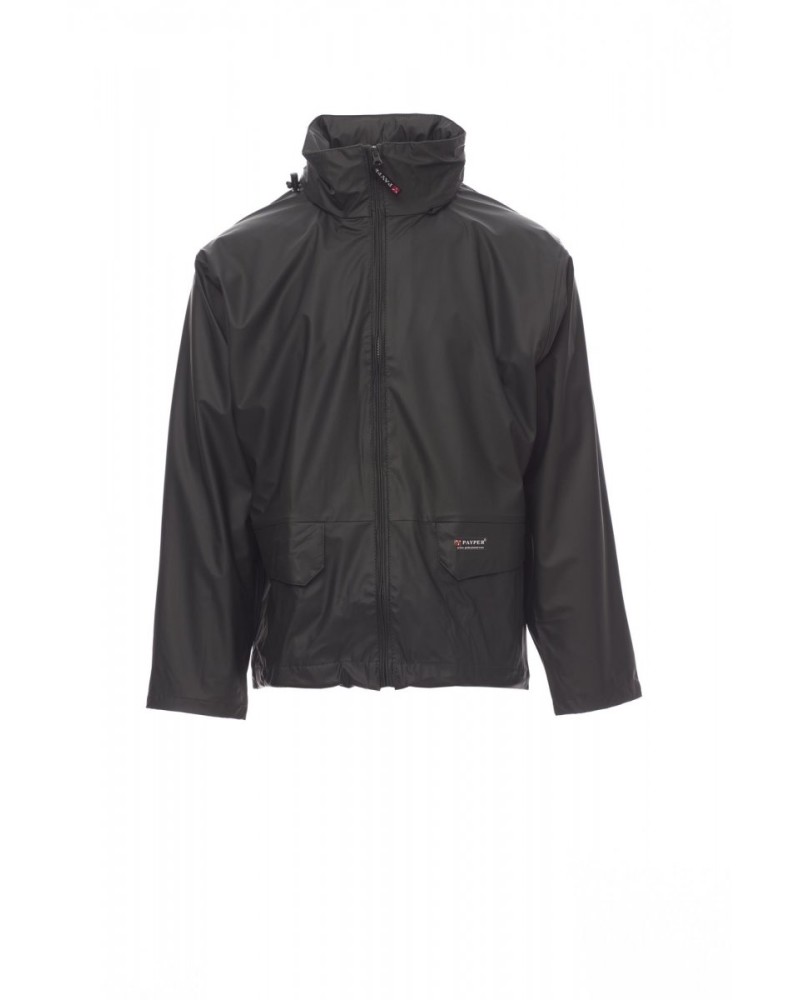 Dežna jakna z zapenjanjem po celi dolžini na skrito plastično zadrgo s kovinskim drsnikom, zložljivo kapuco v ovratniku, nastavljive manšete z gumbi na zapenjanje, vrvico okoli pasu, dvema našitima žepoma ter šivi, odpornimi na toploto.