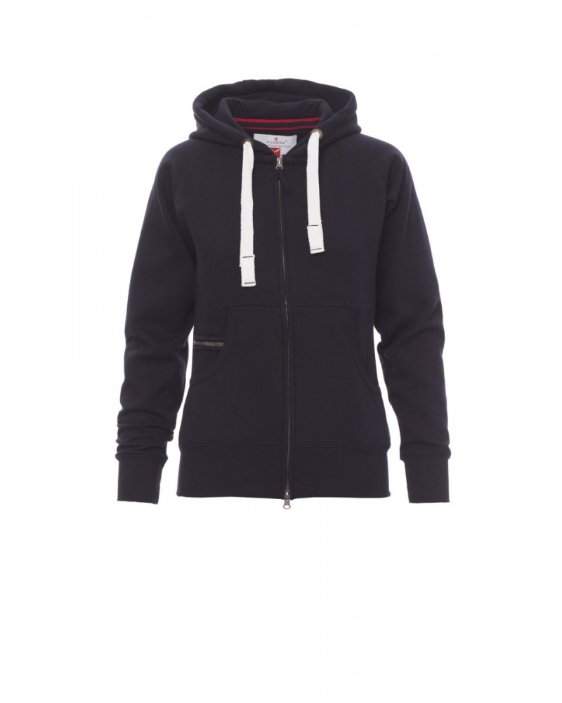 Zenska jopa s kapuco z dvosmerno plastično zadrgo SBS z dvojnim kovinskim držajem, kapuca z dvojnimi šivi in belo vrvico s kontrastnimi šivi in kovinskima obročema, raglan rokavi, kenguru žepi, majhen žep z zadrgo, raztegljivi patentni manšeti in spodnji rob, ojačani šivi.