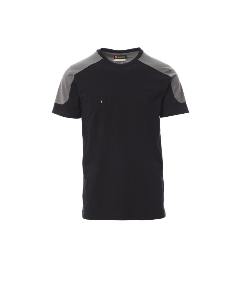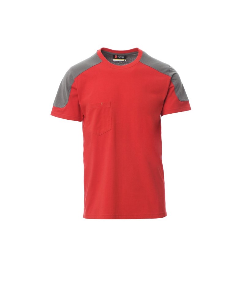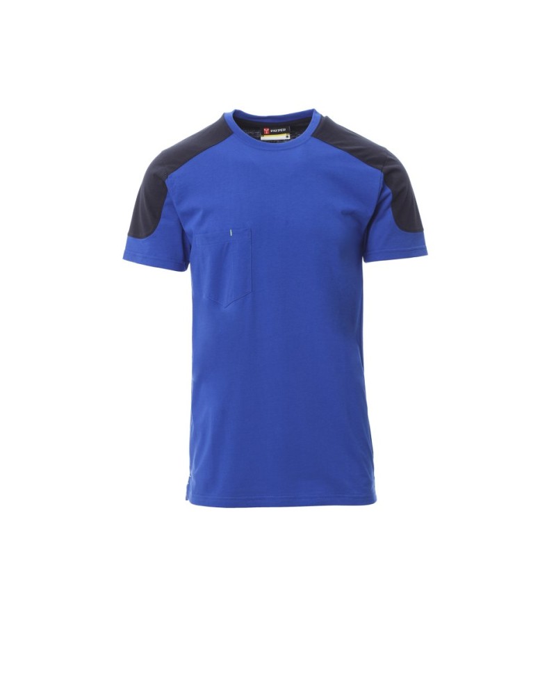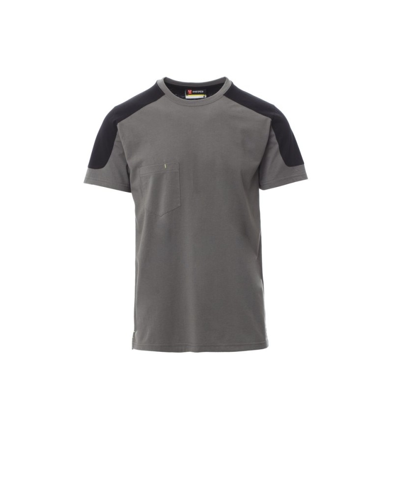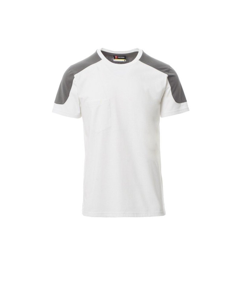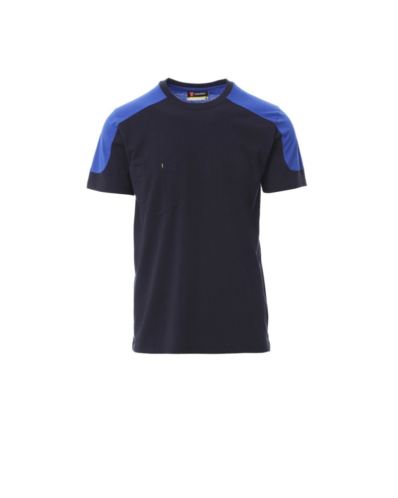 Dvobarvna majica, žep na prsnem delu z odprtino za pisalo, pokriti šivi ovratnika in trak za ojačanje ob strani.