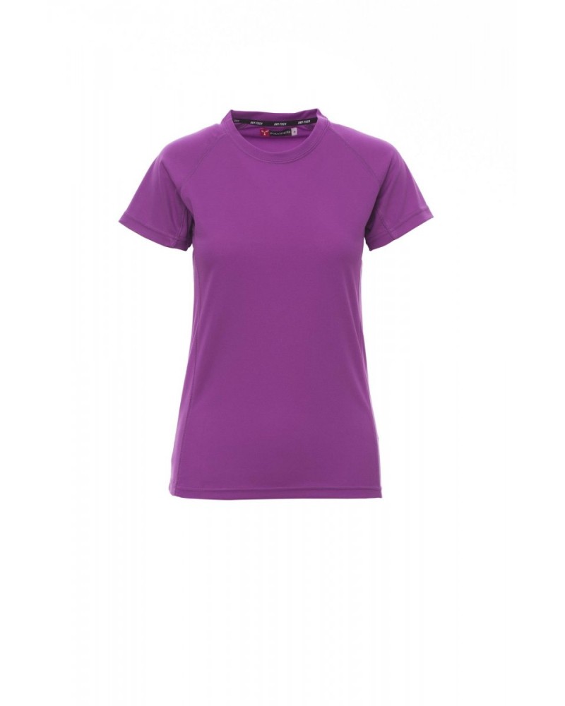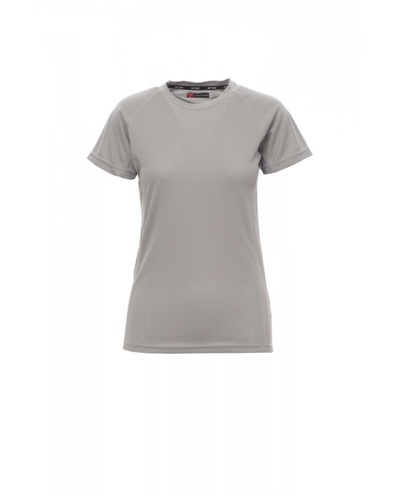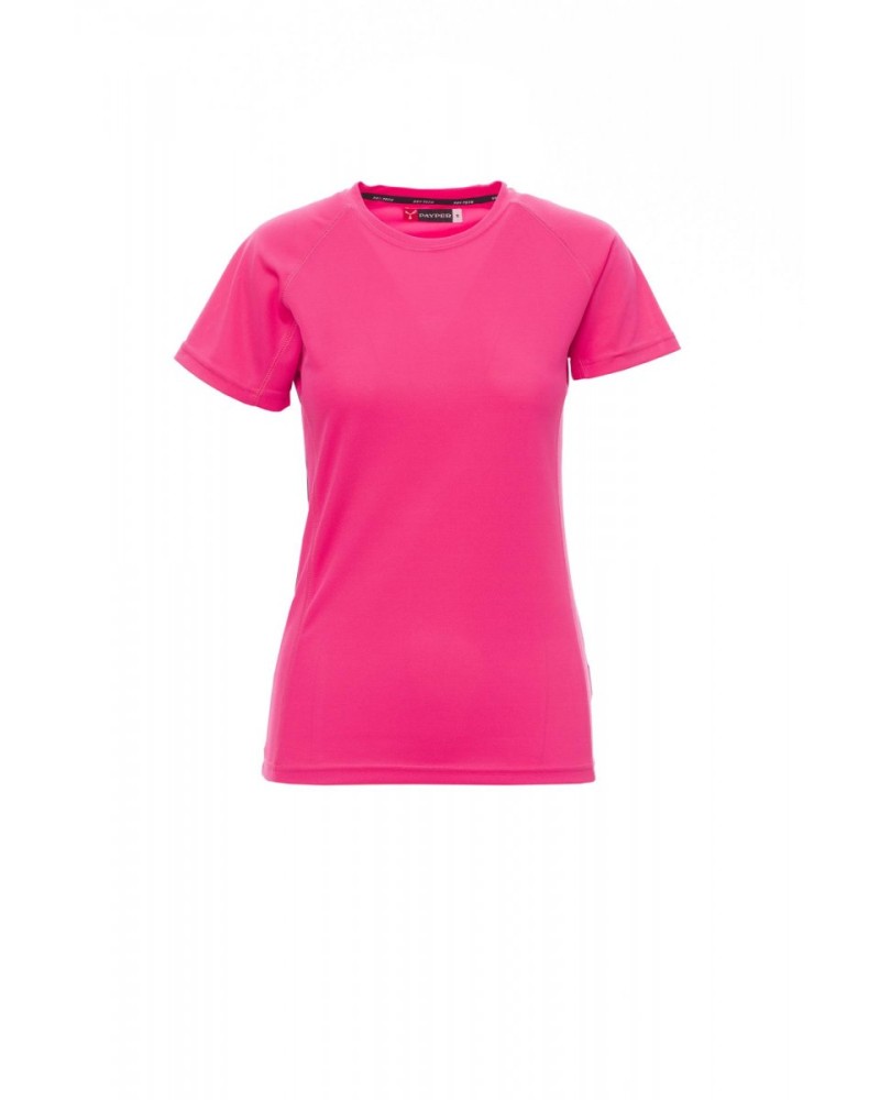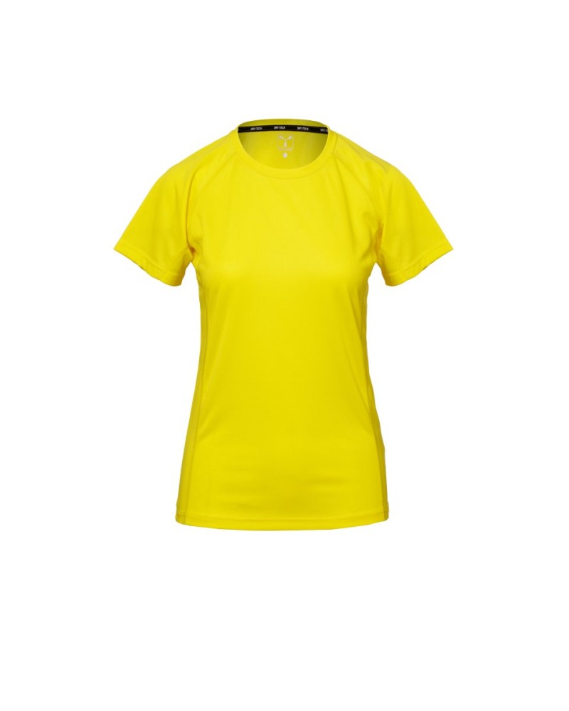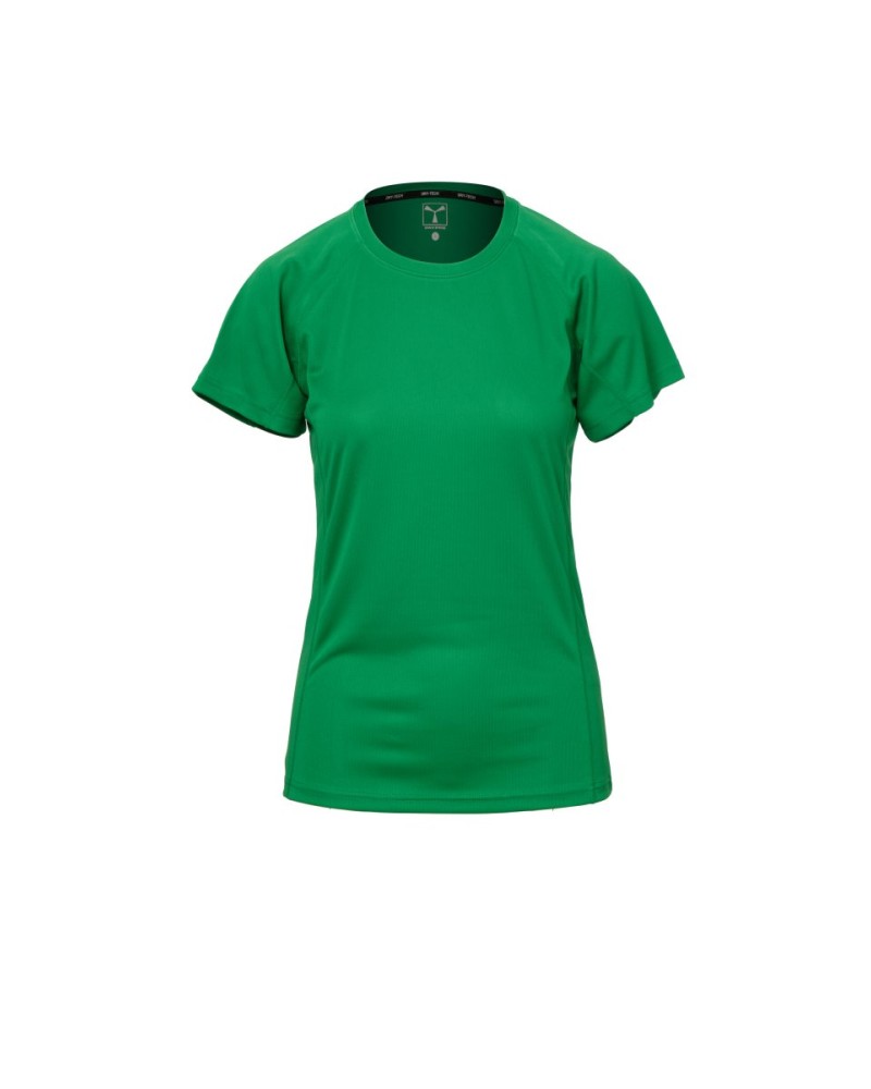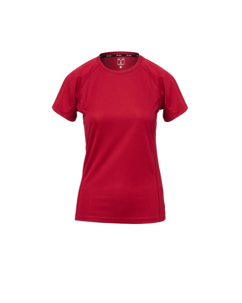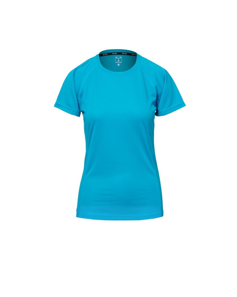 Zenska tehnično-športna prilegajoča se majica z rokavi raglan, dvojni stranski šivi za bolj udobno prileganje, trak na ovratniku.