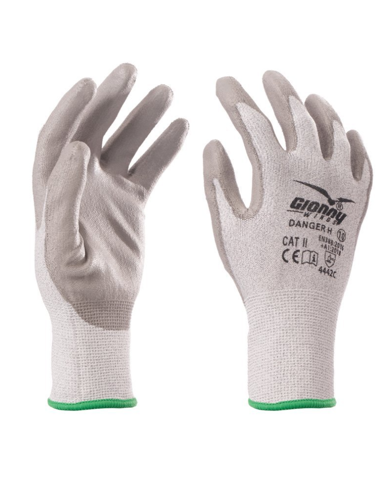 Polietilenske rokavice za zahtevnejša opravila (13 G), z zračno hrbtno stranjo, pletenim zapestnim delom s prevleko iz poliuretana. Lastnosti: čvrsto. Prednosti: oprijem, natančnost, občutljivo, protivrezno, udobje. Področja uporabe: opravila in sestavljanje rezanih, suhih ali rahlo oljnatih elementov.