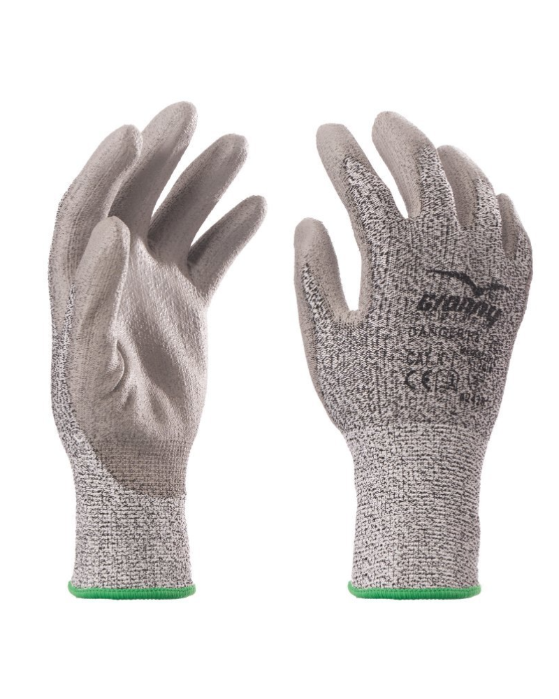 Polietilenske rokavice za zahtevnejša opravila (13 G), z zračno hrbtno stranjo, pletenim zapestnim delom s prevleko iz poliuretana. Lastnosti: čvrsto. Prednosti: oprijem, natančnost, občutljivo, protivrezno, udobje. Področja uporabe: opravila in sestavljanje rezanih, suhih ali rahlo oljnatih elementov.