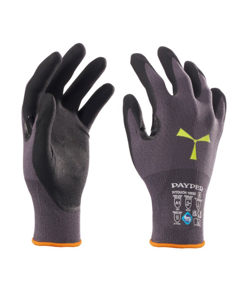 Rokavice iz najlona/elastana in ogljikovih vlaken, antistatična preja 15G, s pletenim zapestnim delom, nitrilnim ojačanjem med palcem in kazalcem ter prevleko iz nitrilne mikropene na dlani za odličen oprijem. Dlan za upravljanje zaslona na dotik. Lastnosti: udoben in prilagodljiv material. Prednosti: udobje, prilagodljivost. Področja uporabe: lažje delo v suhih okoljih ali z zmerno prisotnostjo olj/ogljikovodikov, ki zahtevajo občutljiv oprijem in svobodno gibanje. Dolgotrajna svežina s higieničnim delovanjem Sanitized®.