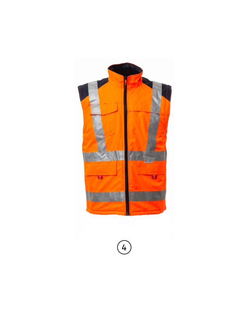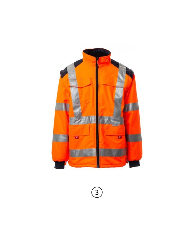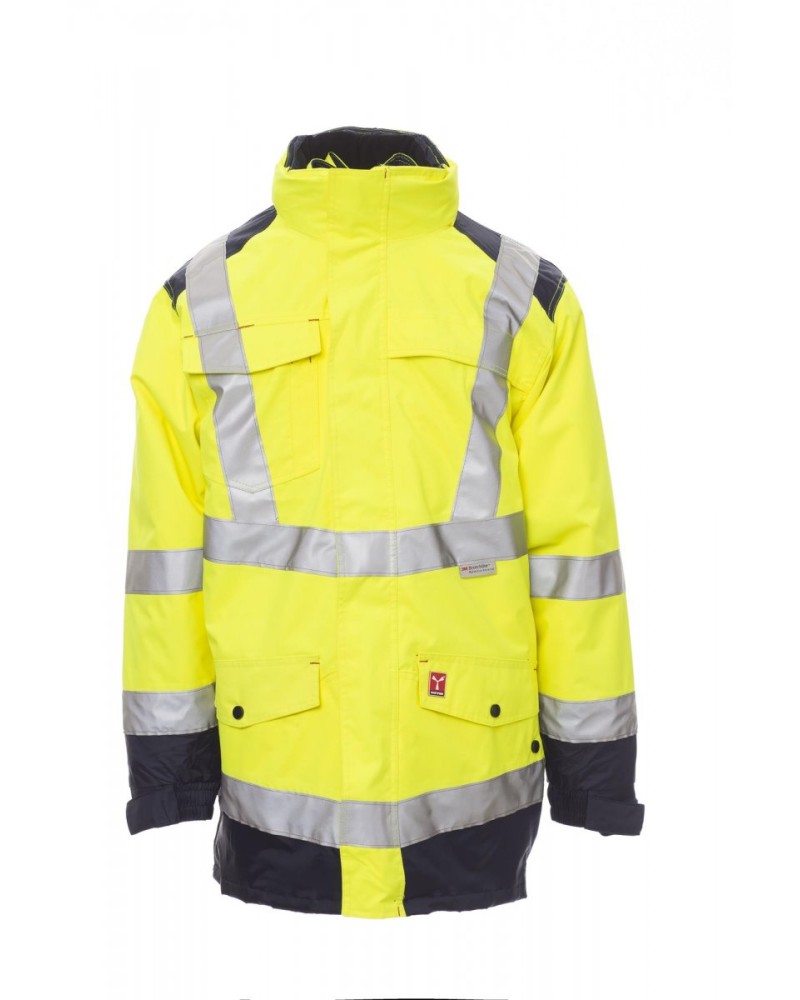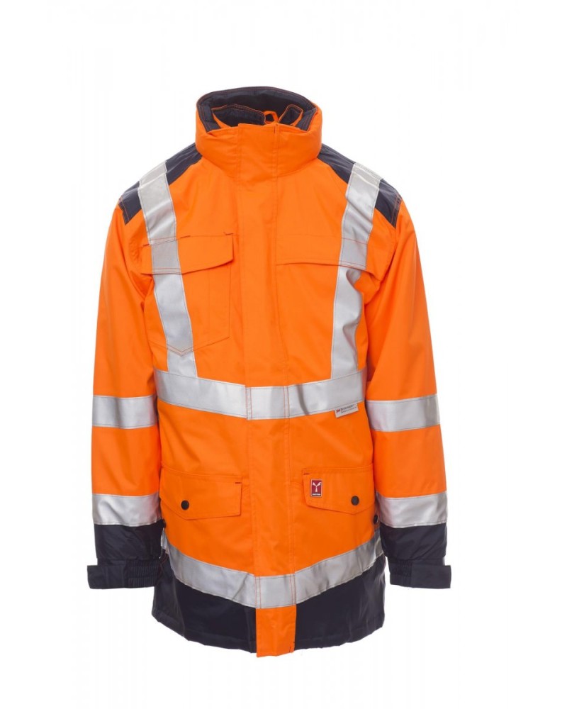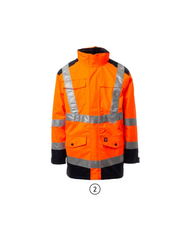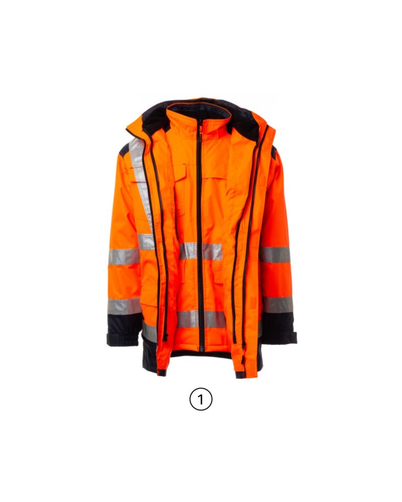 Dvobarvna parka 4 v 1 visoke vidljivosti z odsevnimi črtami. Zunanja jakna brez podloge, plastična zadrga s kovinskim drsnikom, pokrita z zavihkom in ježkom, kapuca s snemljivo in/ali zategljivo vrvico v ovratniku, nastavljive elastične manšete. 4 sprednji žepi: desni prsni z ježkom, držalom za pisalo in skritim držalom za značko; srčni stranski z zadrgo; 2 spodnja žepa z zadrgo in zaskočnim gumbom ter stransko odprtino. Podložen notranji jopič s snemljivimi rokavi, plastična zadrga s kovinskim drsnikom, elastična manšeta. 4 sprednji žepi: desni prsni z ježkom, držalom za pisalo in skritim držalom za značko; stranska odprtina z zadrgo; 2 spodnja žepa z ježkom. Na obeh: ovratnik in ramena iz mikroflisa, zadrga za lažje tiskanje in vezenje, dva trakova na prsih, ramenih in rokavih.