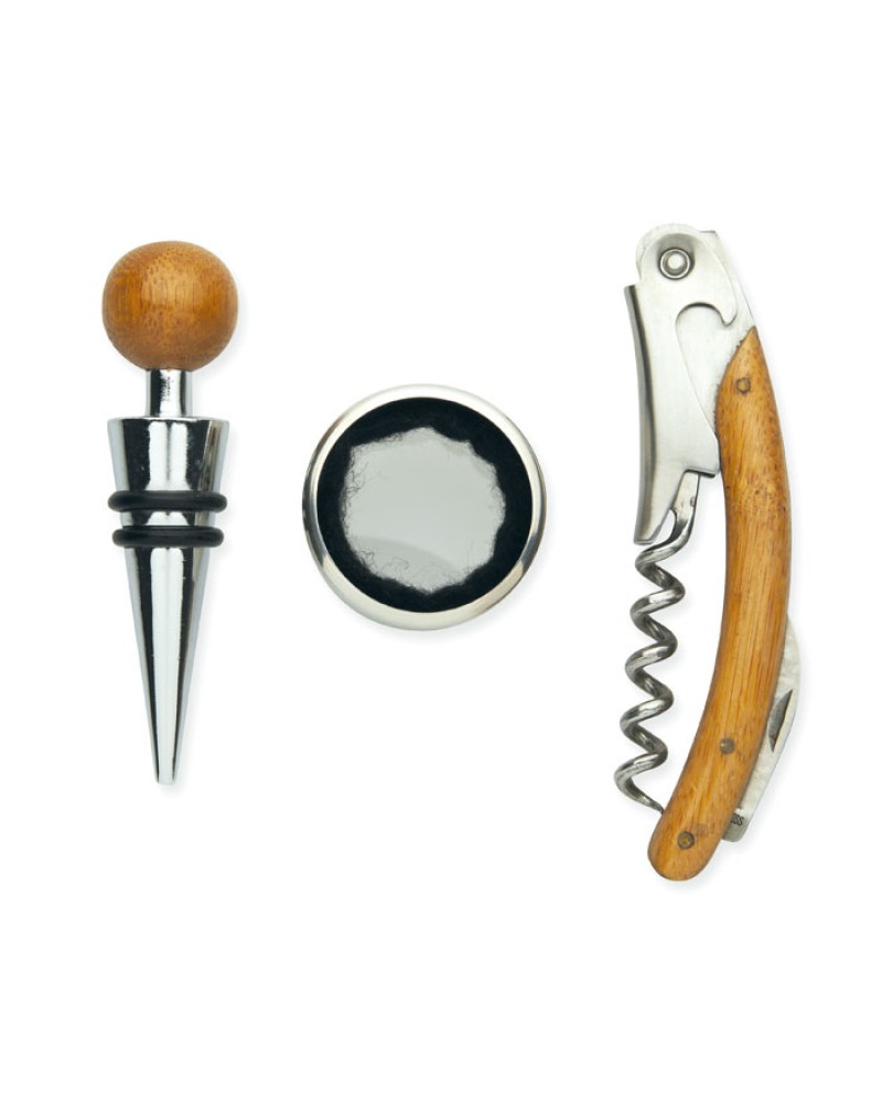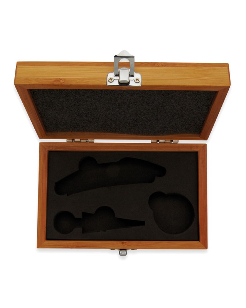 Vinski set v bambusovi škatli vsebuje odpirač, vinski ovratnik in zamašek iz nerjavečega jekla in bambusa. Bambus je naravni material, zato se lahko barva in velikost posameznega izdelka nekoliko razlikujeta, kar lahko vpliva na končni rezultat dekoracije.
